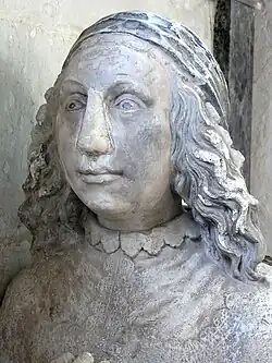 Grace Halswell (died 1675), wife of Sir John Northcote, 1st Baronet (1599–1676). Detail from her kneeling effigy at base of monument to her father-in-law John Northcote (1570–1632), Newton St Cyres Church