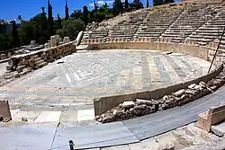 At some point at Athens in the Classical period a small stoa colonnade was constructed behind the scene-building with its back to the theatre and would have provided a permanent backdrop for the action."[3]