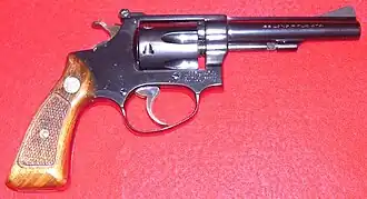 The Smith & Wesson Model 34 Kit Gun is a small, 6-shot, .22 Long Rifle, double-action revolver made by Smith & Wesson. It came with a 2-inch or 4-inch barrel and has adjustable-sights. It was designed to be easily packed in a hunting or fishing "kit" for small game hunting, plinking, pest control and self defense.
