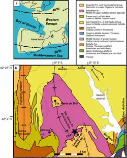 The Castejón de Sobrarbe-41 locality is thought to have been a channel within the tidal zone of the Bay of Biscay, a deep marine gulf located between the Iberian Peninsula and mainland Europe during the Eocene. The fact that the bones of Sobrarbesiren are well preserved but disarticulated and widely dispersed has been interpreted by Díaz-Berenguer and colleagues to mean that the channel containing the bones was filled by sediment in a single event, burying the bones instantly. Fossil foraminifera show that sea grasses could be found in the Ainsa Basin during the Eocene.[1]