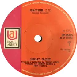 Among the song's many cover versions, Welsh singer Shirley Bassey recorded a successful version of "Something".[138] It was released in 1970 as the title track to her album of the same name.[139] Also issued as a single, it became Bassey's first top-ten hit in the UK since "I (Who Have Nothing)" in 1963, peaking at number 4 and spending 22 weeks on the chart.[140] The single also reached the top twenty in other European countries[141] and peaked at number 6 on Billboard's Easy Listening (later Adult Contemporary) chart.[142]
