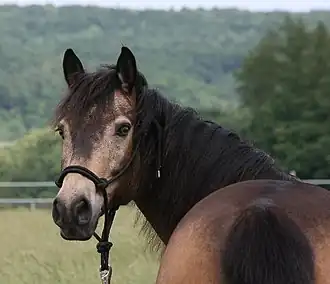 A sooty or smutty[1] horse coat color is characterized by black or darker hairs mixed into a horse's coat, typically concentrated along the topline of the horse and less prevalent on the underparts. The effect is especially pronounced on buckskins and palominos. Sootiness is believed to be an inherited trait involving multiple genes, however the details are not yet known. Horses without any visible sooty coloration are termed "clear-coated."