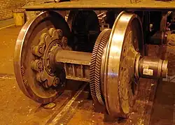 All earlier South African electric locomotives, with the exception of the Orex Line's Class 9Es, ran on spoked wheels using spur gears. Amongst South African electric locomotives, the Class 14E was the first to have solid wheels with double helical or herringbone gears and with a traction motor to wheel gear ratio of 20:103. This gear ratio had the result that, while the three prototypes were very fast, they struggled to pick up a load. The locally built Class 14E1, on the other hand, ran on spoked wheels with helical gears and had a more conservative traction motor to wheel gear ratio of 18:67.[5]