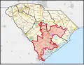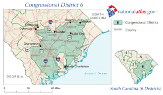 South Carolina's 6th congressional district is in central and eastern South Carolina. It includes all of Allendale, Bamberg, Calhoun, Clarendon, Hampton, and Williamsburg counties and parts of Charleston, Colleton, Dorchester, Florence, Jasper, Orangeburg, Richland and Sumter counties. With a Cook Partisan Voting Index rating of D+13, it is the only Democratic district in South Carolina.[2]