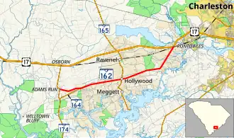 South Carolina Highway 162 (SC 162) is a 13.540-mile (21.791 km) state highway in the U.S. state of South Carolina. The highway connects Adams Run and Rantowles, via Hollywood.