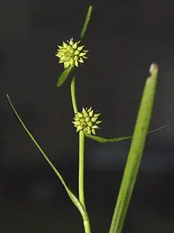 Sparganium natans is a species of bur-reed known by the common names least bur-reed[2] and small bur-reed.[3] It is a water circumboreal plant inhabiting North America, Europe, West Asia and Japan. It is usually found submersed in shallow, calm water. This bur-reed has thin, flexible, grasslike leaves which float in the water. Plants that spend more time out of water at the waterline are tougher and have shorter leaves. The plant bears two inflorescences, the staminate type being a rounded white filamentous ball and the pistillate type a sphere of thick, green, pointy peduncles. The fruits are small green or brown achenes.