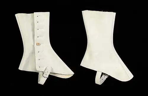 Spats were worn by men and, less commonly, by women in the late 19th and early 20th centuries. They fell out of frequent use during the 1920s. Made of white cloth, grey or brown felt material, spats buttoned around the ankle. Their intended practical purpose was to protect shoes and socks from mud or rain, but they also served as a feature of stylish dress in accordance with the fashions of the period.[1] Emily Post's 1931 Etiquette: The Blue Book of Social Usage stated, "Spats are optional. If chosen, they must match the gloves exactly."[2]