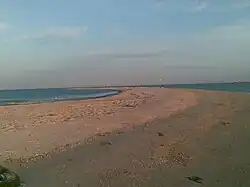 Most spits have a triangular base and numerous lagoons on their west side. The ends of some spits are widened and bent westwards. Their shape rapidly varies with time. For example, the Arabat Spit (the largest and most stable spit on the Azov Sea) was formed only around 1100–1200 AD,[4] and some spits were partly or entirely washed away by water currents.[5] Many spits are used as resting ground by migrating birds (mostly ducks, geese, swans, sandpipers, great cormorants and seagulls, see e.g. this and this pictures) and therefore some are declared national nature reserves. Examples are the Beglitsk,[6] Bilosaraysk,[7] Kriv[7] and Berdiansk spits. In addition to bird colonies, the Bilosaraysk and Berdiansk spits also host more than 200 vegetation species each.[8][9][10] The Berdiansk Spit is remarkable for having one of the oldest lighthouses on the Azov Sea (160 years old).[11] The Petrushino Spit is historical in that in 1697, Peter I built a major fortress at its base.[12] In July 1711, a Turkish landing operation was defeated there.[13]