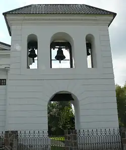 Adjacent to the church is a freestanding bell tower, which took its present form during the renovation at the end of the 19th century. It can accommodate three bells and is covered with a four-sided roof.[3]