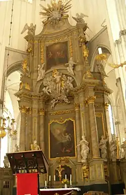 The high altar was built in 1721 by a Berlin craftsman, mainly from painted wood. The altar shows in three pictures; Bottom: " The Last Supper "; Middle: " The Resurrection "; Top: " The Effusion of the Holy Spirit " .