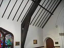 The exterior walls were covered with white stucco. The facades on the southwest end over the baptistery were partitioned by exposed wooden trim (trim and mouldings typical of 14th century Rural Gothic). This theme was also retained over the southwest entrance and within the chancel gable. Exposed timber structure was generalized along with asymmetrical massing and contrasting roof-levels.[11]