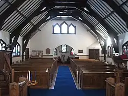 The church presented different types of the architecture typical of Gothic revival: the double pointed arch on the windows along the nave and sanctuary and baptistery (most of them with colourful stained glass and most of them dating from the first half of the 20th century) featuring figures and scenes from the New Testament[11] Two of the stained glass windows (dating from 1992) were a fine blend of contemporary art and Christian imagery (the New Heaven window and the New Earth window. One exception to the New Testament thematic is "The Galahad window" based on Alfred, Lord Tennyson's version of the Arthurian legend and the quest for the Holy Grail (Le Morte d'Arthur) - in the Gothic style.