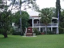 The site is heavily treed, except for a wide expanse of lawn to the west of the house. Two established Jacaranda trees sit between the north-west corners of the house and the allotment. A large native pine tree sits between the northern face of the house and the Kalare Street boundary. The second of the early photographs featured in the 1988 Morning Bulletin article suggests that part of the property was densely covered with trees as it is in 2003, but it is not possible to ascertain which remain from this earlier planting scheme, other than the date palms at the entry gate. The remains of a large clay pit are located on the two southerly adjacent allotments. These are not included in the heritage listing for St Aubins.[1]