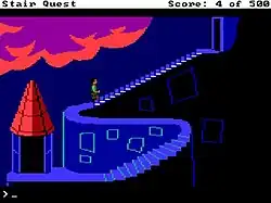 Stair Quest is a non-commercial comedy adventure game serving as an homage to Sierra's King's Quest series and similar games, originally released in 2016. The game takes place within a classic Sierra game interface; despite this, however, you are tasked primarily with traversing screens full of stairs to comedic effect, an aspect of Sierra's earlier adventure games that has been noted as a point of contention among players for difficulty.