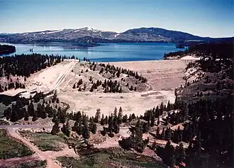 The reservoir it creates, Stampede Reservoir, has a water surface elevation of 5,955 feet (1,815 m) and an area of about 3,340 acres (1,350 ha) and about 25 miles (40 km) of shoreline, with a maximum capacity of 226,500 acre-feet (279,400,000 m3).[2][3] Recreation includes fishing (for kokanee salmon, rainbow, brook, brown and lake (mackinaw) trout, etc.), hunting, boating, camping and hiking. There is an accessible viewing platform at Stampede Vista Point.[4]
