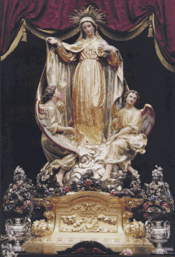 The star on Mary's robe alludes to her epithet of Stella Maris. -