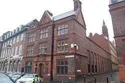 The 1933 station itself, in neo-Georgian style[1] is not a listed building, but the adjacent, late-nineteenth century cell block on the corner of Coleridge Passage was given Grade II protection on 8 July 1982 for its special architectural interest: the three-story building has a brick and terra cotta facade with many ornaments, and it has a slate roof.[5] The station sits in Birmingham City Council's Steelhouse Lane conservation area, which was designated in October 1993.[1] A tunnel links the cell block to the courts.[2]
