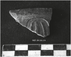 • a ceramic fragment with what appears to be the corona of a four-veined cactus in a Chavín-era midden in the Wacheqsa sector, where the Mosna and Huachecza rivers meet.[36]