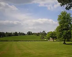 The south vista includes the tree-flanked sloping lawns to the south of the House down to the Octagon Lake and a mile and a half beyond to the Corinthian Arch beyond which stretches the Grand Avenue of over a mile and a half to Buckingham. This is the oldest area of the gardens. There were walled gardens on the site of the south lawn from the 1670s that belonged to the old house. These gardens were altered in the 1680s when the house was rebuilt on the present site. They were again remodelled by Bridgeman from 1716.[57] The lawns with the flanking woods took on their current character from 1741 when 'Capability' Brown re-landscaped this area.[58]