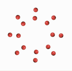 Fixate on any red spots and you will perceive eight pairs of spots rotating about their common centre. But fixate in the middle and the very same movements can spontaneously re-group into a more global view, of two pulsating, intersecting octagons. This suggests that the visual system parsimoniously attempts to group the maximum number of moving balls into the minimum number of groups.