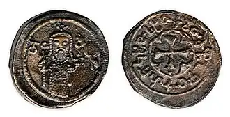meaning "Jesus Christ, [glorify] King David, of the Abkhazians,[h] Iberians,[c] Ranis,[n] Kakhetians,[n] Armenians"[j]. The king is depicted wearing sakkos with an imperial crown having pendilia and holding a cross alongside globus cruciger. A coin shows the king as a true Byzantine emperor.[k] Kept at the British Museum in the United Kingdom since 1857.[p]