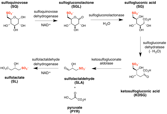 • The sulfoglycolytic Entner-Doudoroff (sulfo-ED) pathway, first identified in Pseudomonas putida SQ1, involves the degradation of sulfoquinovose to sulfolactate,[4] and shares similarity to the Entner-Doudoroff pathway of glycolysis. This pathway leads to the production of the C3 intermediate pyruvate.
