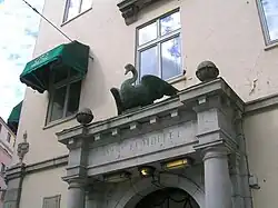 Bergen was a pioneer town where people went to make wealth by fishing or working in the timber or fur industry. The first pharmacist to work there was the Dutchman Lambert Gregerson Friis and he was shortly joined by another Dutch apothecary Nicolas de Freundt who also had no formal training but applied for a permit to Christian IV. The permits was received in December 13, 1595 by Freundt who was given the right to start two pharmacies which were sold some years later but only the Swan pharmacy remained and moved to Danish hands. A second Swan apothecary was opened in Oslo by Dane Baltsar Brabant in 1628.[1] The swan was a symbol of intelligence and purity and was widely used symbols by medieval apothecaries in Finland and Denmark.[2] The building is now a part of the pharmacy chain Apotek 1.