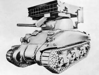 The 7.2-inch Multiple Rocket Launcher T40/M17 Whizbang (sometimes spelled Whiz-Bang or Whiz Bang) was a tank-mounted multiple rocket launcher used by the United States Army during World War II. The launcher was mounted atop 75mm variants of the M4 Sherman, and fired a barrage of 7.2 in (180 mm) rockets from 20 launch tubes.[1] It was developed and used in the late stages of the war, and saw limited combat in 1944–45.[3]