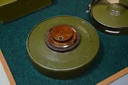 The TM-62 is a series of Soviet anti-tank blast mines produced in various variants. It served as the primary anti-tank landmine for the Soviet military.[4] It has a central fuze and typically a 7.5 kilograms (17 lb) explosive charge, but the variants differ greatly in detail. The mine can be laid manually or automatically from a mine laying machine including the PMR-1, PMR-2 wheeled towed mine layers, the GMZ-3 tracked mine laying vehicle and the VMR-2 helicopter mine laying system. The TM-62 can be fitted with the same fuzes as the TM-72, which include MVN-72 and MVN-80 fuzes, which are vibration and magnetism sensitive. The mine was used in the 2022 Russian invasion of Ukraine for antitank and antipersonnel use (as satchel charges).[3]