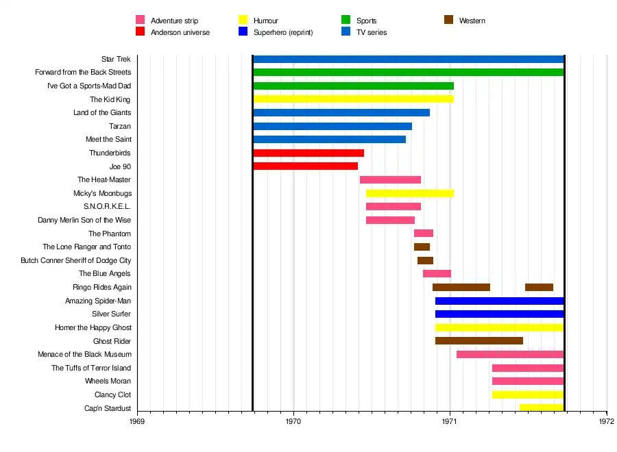 After losing the Gerry Anderson license in mid-1970, TV21 became a television comic virtually in name only, with the Star Trek strip being the lone feature still related to TV. The publication became more typical of other British comics of the era, featuring a mix of adventure, humour, Western, and sporting strips, some of which were reprints from other publications. Marvel Comics reprints became a feature in the magazine's final year of publication.