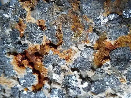 - galena (PbS): very common; crystals can reach several centimeters; occurs most often weathered (with a coating of iron oxide), often dull (due to oxidation), yet can display a brilliant luster and show excellent quality in some protected tension gashes; cubes and octahedra; grows on quartz, sometimes on calcite, dolomite or baryte; overgrown by cerussite, pyrite, marcasite, quartz and ozocerite.