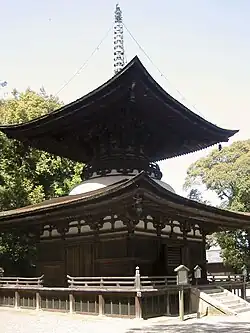 A tahōtō (多宝塔, lit.'many-jewelled pagoda'; pronounced [tahoːtoː]) is a form of Japanese pagoda found primarily at Esoteric Shingon and Tendai school Buddhist temples. It is unique among pagodas because it has an even number of stories (two). (The second story has a balustrade and seems habitable, but is nonetheless inaccessible and offers no usable space.)[1] Its name alludes to Tahō Nyorai, who appears seated in a many-jewelled pagoda in the eleventh chapter of the Lotus Sutra.[2][3] With square lower and cylindrical upper parts, a mokoshi 'skirt roof', a pyramidal roof, and a finial, the tahōtō or the larger daitō was one of the seven halls of a Shingon temple.[4] After the Heian period, the construction of pagodas in general declined, and new tahōtō became rare. Six examples, of which that at Ishiyama-dera (1194) is the earliest, have been designated National Treasures.[5] There are no examples in China, whether architectural or pictorial, of anything that resembles the tahōtō, although there is a Song dynasty textual reference to a tahōtō with an encircling chamber'.[6]