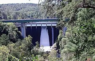 Tallulah Falls Lake was formed in 1914 with the completion of the Tallulah Falls Dam, a concrete dam with diversion tunnel. The diversion tunnel is 11 feet (3.4 m) wide, 14 feet (4.3 m) high, and 6,666 feet (2,032 m) long and was tunneled through solid rock and then lined with concrete. The dam is 126 feet (38 m) high and has a span of 426 feet (130 m). The Tallulah Falls Hydroelectric Plant is located 608 feet (185 m) lower than the dam at the lower end of the tunnel and has a generation capacity of 72,000 kilowatts.