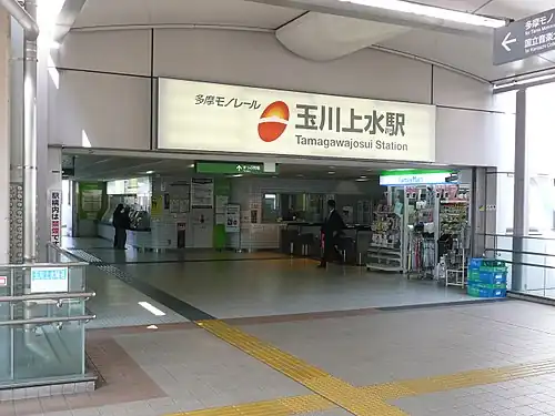 Tamagawa-Jōsui Station (玉川上水駅, Tamagawa Jōsui-eki) is a passenger railway station located in the city of Tachikawa, Tokyo, Japan, operated by the private railway operator Seibu Railway, and a monorail station operated by the Tokyo Tama Intercity Monorail in Higashiyamato, Tokyo, Japan. The two stations are adjacent to, and at right angles to one another, with the border between the two cities passing in between the stations. The names of the stations are identical in Japanese, but are transliterated slightly different in romaji such that the Seibu Station is Tamagawa-Jōsui Station, whereas the Tokyo Tama Intercity Monorail is Tamagawajosui Station (i.e. without the hypen or diacritic mark).
