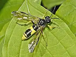 The adults of Tenthredo temula are up to 10–13 millimetres (0.39–0.51 in) long.[3] The thorax and head are brilliant black, clypeus, labrum and the base of mandibles are yellow, the abdomen is black with a transversal yellow band and a yellow tip. Femora and tibia are black in males, respectively black and yellow in females. The wings are brown and transparent, with brown veins and black stigma.[4][5]