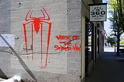 The main viral marketing site was revealed in the second trailer in February 2012.[165] The official Twitter account revealed a scavenger hunt by posting "Property of Peter Parker... Lost" with the longitude and latitude coordinates of direct markets in major US cities. The missing items included a JanSport backpack. One of the clues hidden in the backpack was a link to a page on the viral site that unlocked countdown timers for the cities of Los Angeles, New York City, Atlanta, Denver, Seattle and Phoenix, Arizona.[180][181] Once the countdown was up, each of the city-specific Twitter accounts for the marketing campaign sent out five locations in each city. A person at each spot waited to give the first person with the password a package and the tag-name "operative".[182] These operatives painted the Spider-Man logo as graffiti.[183] The operatives then could view a scene related to the film.[184] The main viral website revealed hints to other websites, such as a photo blog that expressed Peter Parker's point of view.[185][186] An unlocked puzzle there revealed the words "evolve", "through" and "engineering" which when put together led to another website with design sketches on how to build a web-shooter.[186][187][188]