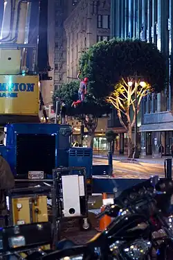 Webb stated that he and the crew wanted to keep the stunts more grounded physically, a challenge for a superhuman character.[63] The stunt performers included the Armstrong family,[63] Vic[112] and Andy, along with Richard Norton who plays a SWAT team member.[113][114] Andy Armstrong was the stunt coordinator while Vic was the second unit director.[107] To determine how Spider-Man should swing, Andy videotaped an Olympic Games gymnast swinging on a horizontal bar.[115] Andy noted that in the computer-generated swing in the earlier Spider-Man films, "he swings down at the same speed as he swings up," and this "constant" speed is unlike a real gymnast's movement where "he's accelerating until he reaches the bottom, then as he starts to come up, he's decelerating until he gets to the top of his swing and he actually gets negative gravity, where he'll go weightless for a second, and then the next swing starts, and it becomes another violent swing again."[116] Vic felt that Spider-Man's moves were comparable to those of Tarzan, and he wanted to add that in the film.[117] While filming in New York City, they swung a man through traffic down the street. Then, while the crew built a rig hundreds of feet long over Riverside Drive in Harlem, Andy built a car rig with a series of wires to help with effects which Webb said required an "incredible wealth of acrobatics".[114] These rigs were over 200–300 feet long and demanded months of rehearsals and design.[107] According to Andy, operating the rigs "was a combination of a lot of human skills and mechanical engineering."[116] The purpose of the rigs was to depict Spider-Man's swing in a way that wasn't computer-generated.[63] Garfield was reported to be involved with some of the stunts.[118] Arad explained that "Andrew is not only a brilliant actor but he is a sportsman. This gave us the opportunity to try things with him that were it not so it would have been almost impossible."[119]
