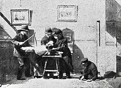 ![]() Film still of the female bandit (center figure), dressed as a man and aiming her pistol at a police officer | |