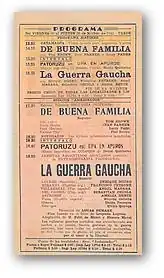 The Gaucho War (La guerra gaucha) is a 1942 Argentine historical drama and epic film directed by Lucas Demare and starring Enrique Muiño, Francisco Petrone, Ángel Magaña, and Amelia Bence. It is one of the most celebrated works of the Golden Age of Argentine cinema. The film's script, written by Homero Manzi and Ulyses Petit de Murat, is based on the novel by Leopoldo Lugones published in 1905. The film premiered in Buenos Aires on November 20, 1942 and is considered by critics of Argentine cinema to be one of the most successful films in history.[1]