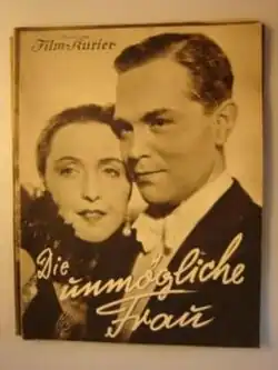 The Impossible Woman (German: Die unmögliche Frau) is a 1936 German romance film directed by Johannes Meyer and starring Dorothea Wieck, Gustav Fröhlich and Gina Falckenberg.[1] It was shot at the Johannisthal Studios in Berlin and partly on location in Romania. It was based on the novel Madame will nicht heiraten by Mia Fellmann.