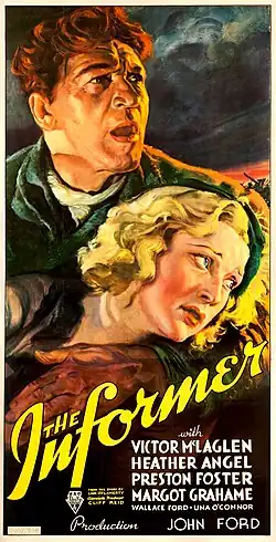 The Informer is a 1935 American drama thriller film directed and produced by John Ford, adapted by Dudley Nichols from the 1925 novel of the same title by Irish novelist Liam O'Flaherty. Set in 1922, the plot concerns the underside of the Irish War of Independence and centers on a disgraced Republican man, played by Victor McLaglen, who anonymously informs on his former comrades and spirals into guilt as his treachery becomes known. Heather Angel, Preston Foster, Margot Grahame, Wallace Ford, Una O'Connor and J. M. Kerrigan co-star. The novel had previously been adapted for a British film of the same name in 1929.