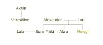 - Alexander - Mowgli's wolf father, Luri's mate, and the biological father of Akru and Sura. He is blue/black furred. He becomes leader of the wolf pack when Akela chooses to retire. He has a fight with Vermillion, despite being unwilling to do so, to determine the successor to Akela's leadership, in accordance with the Law of the Jungle. During a fire that grazes the forest, Alexander dies defending his pack from Shere Khan.