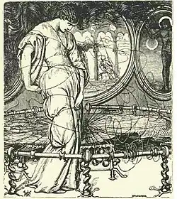 8. ^ McMahon Bourke, Allyson (1996). "Tennyson's Lady of Shalott in Pre-Raphaelite Art". Dissertations. College of William & Mary. doi:10.21220/s2-eybx-jm55. Behind the Lady's head, a frieze of cherubs also reminds her of her female duties. An angel on the right steps with her foot upon a red serpent – just as Eve should have done. The frieze as a whole depicts the music of the spheres and indicates the social harmony that results when women observe social boundaries and serve God as they should.