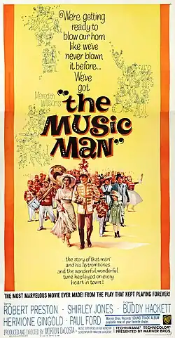 The Music Man is a 1962 American musical film directed and produced by Morton DaCosta, based on Meredith Willson's 1957 Broadway musical of the same name, which DaCosta also directed. Robert Preston reprises the title role from the stage version, starring alongside Shirley Jones, Buddy Hackett, Hermione Gingold, Ronny Howard, and Paul Ford.