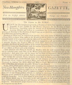 The New Hampshire Gazette was founded in Portsmouth on October 7, 1756, by printer Daniel Fowle as the first newspaper in the Province of New Hampshire. Fowle lived in Boston before founding the Gazette, and was the first to print the words of Samuel Adams. He also spent time in prison for printing anti-British pamphlets "The Monster of Monsters" and "A Total Eclipse of Liberty."