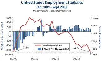 Ultimately, Grunwald accounts how Obama's $787 billion stimulus package amounted to about 4% of America's GDP while, during the Great Depression, the biggest stimulus in any year amounted to just about 1.5% of GDP. The President's early, pre-inauguration plan, at $300 billion, increased given the particularly frustrating unemployment situation. Early 2009 data had presented losses of around 800,000 a month.[2]