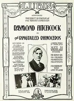 In 1914, the rapidly expanding Lubin Manufacturing Company sought to attract public attention and ticket buyers by convincing stars of vaudeville and the "legitimate" theater, as well as other celebrities, to perform in their first films with Lubin. Two such stage performers contracted by the company in 1914 were the "notorious" actress Evelyn Nesbit Thaw, who made her screen debut in the Lubin production Threads of Destiny, and the comedian Raymond Hitchcock, whose initial foray into films was The Ringtailed Rhinoceros.[5] Widely billed as "'The Funniest Man on the Stage'", Hitchcock had reportedly rejected earlier offers to perform in motion pictures, but the comedian was finally "won over" by Lubin, which created a "unique comedy drama, written especially" for him.[6][7] The Chicago-based trade journal Motography later referred to Lubin's success in contracting Hitchcock for his first screen appearance "a decided triumph".[8]