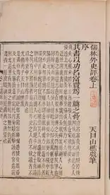 The earliest printed editions of the novel did not survive, and some critics have raised questions about the reliability of later printed editions.[12] The earliest extant edition of The Scholars is the 1803 Wo Xian Caotang edition, commonly referred to as the "Wo" edition. This was followed in 1816 by the Qingjiang Pu Zhu Li Ge ("Qing") and Yi Gu Tang ("Yi") editions, which are both essentially copies of the Wo edition. The Suzhou Fan Shi Chao ("Chao") edition was the personal reading edition of a Qing official. While this edition was quite rare, the following Suzhou Qun Yu Ji ("Su") edition was quite popular, and there are many extant versions of it in circulation. The first Shen Bao Guan ("Shen One") edition corrected the mistakes of previous editions, and the second Shen Bao Guan edition ("Shen Two") carried these corrections further.[13]