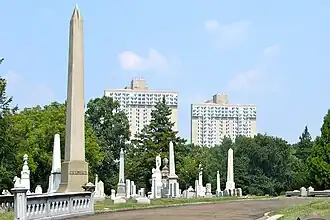 The Woodlands is a National Historic Landmark District on the west bank of the Schuylkill River in Philadelphia. It includes a Federal-style mansion, a matching carriage house and stable, and a garden landscape that in 1840 was transformed into a Victorian rural cemetery with an arboretum of over 1,000 trees. More than 30,000 people are buried at the cemetery.[3] Among the tombstones at Woodlands cemetery is the tombstone of Dr Thomas W. Evans, which at 150 feet (46 m), is both the tallest gravestone in the United States and the tallest obelisk gravestone in the world.[4][5]