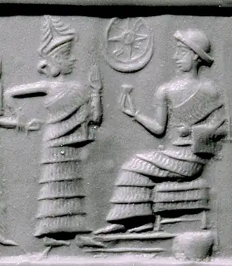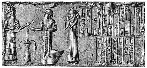 Enthroned King Ur-Nammu, founder of the Third Dynasty of Ur c.โ€‰2047 BC, on a cylinder seal.[3] His name appears vertically in the upper right corner (๐’Œจ๐’€ญ๐’‡‰).